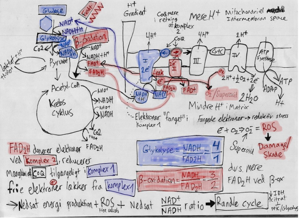 Kort fortalt – mere FAD2H relativt til NADH fanger CoQ ved kompleks 2, og giver elektronlæk ved kompleks 1, som medfører ROS-dannelse