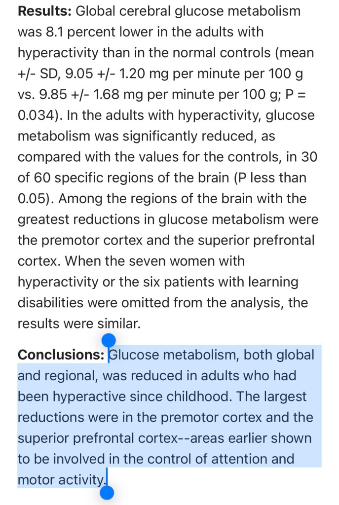 Den hypotese får nu lidt tungere vægt, da det ser ud til at ADHD’s/ opmærksomhedsforstyrrelsens årsag skal findes i en nedsat glukose metabolisme i hjernen både regionalt og globalt. 8,1 % lavere cerebral glukose metabolisme i ADHD gruppen.