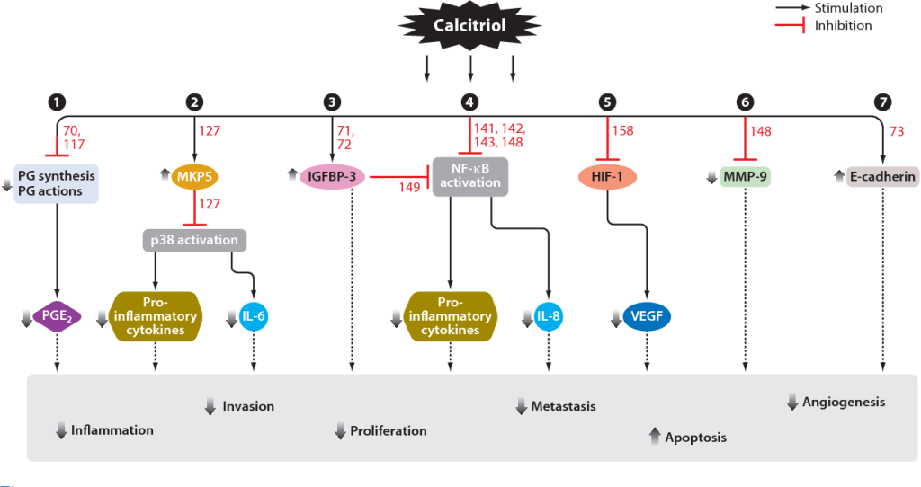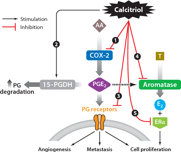 “Calcitriol exerts multiple anti-proliferative, pro-apoptotic, and pro-differentiating actions on various malignant cells and retards tumor growth in animal models of cancer. Calcitriol also exhibits several anti-inflammatory effects including suppression of prostaglandin (PG) action, inhibition of p38 stress kinase signaling, and the subsequent production of pro-inflammatory cytokines and inhibition of NF-κB signaling. Calcitriol also decreases the expression of aromatase, the enzyme that catalyzes estrogen synthesis in breast cancer, both by a direct transcriptional repression and indirectly by reducing PGs, which are major stimulators of aromatase transcription.”